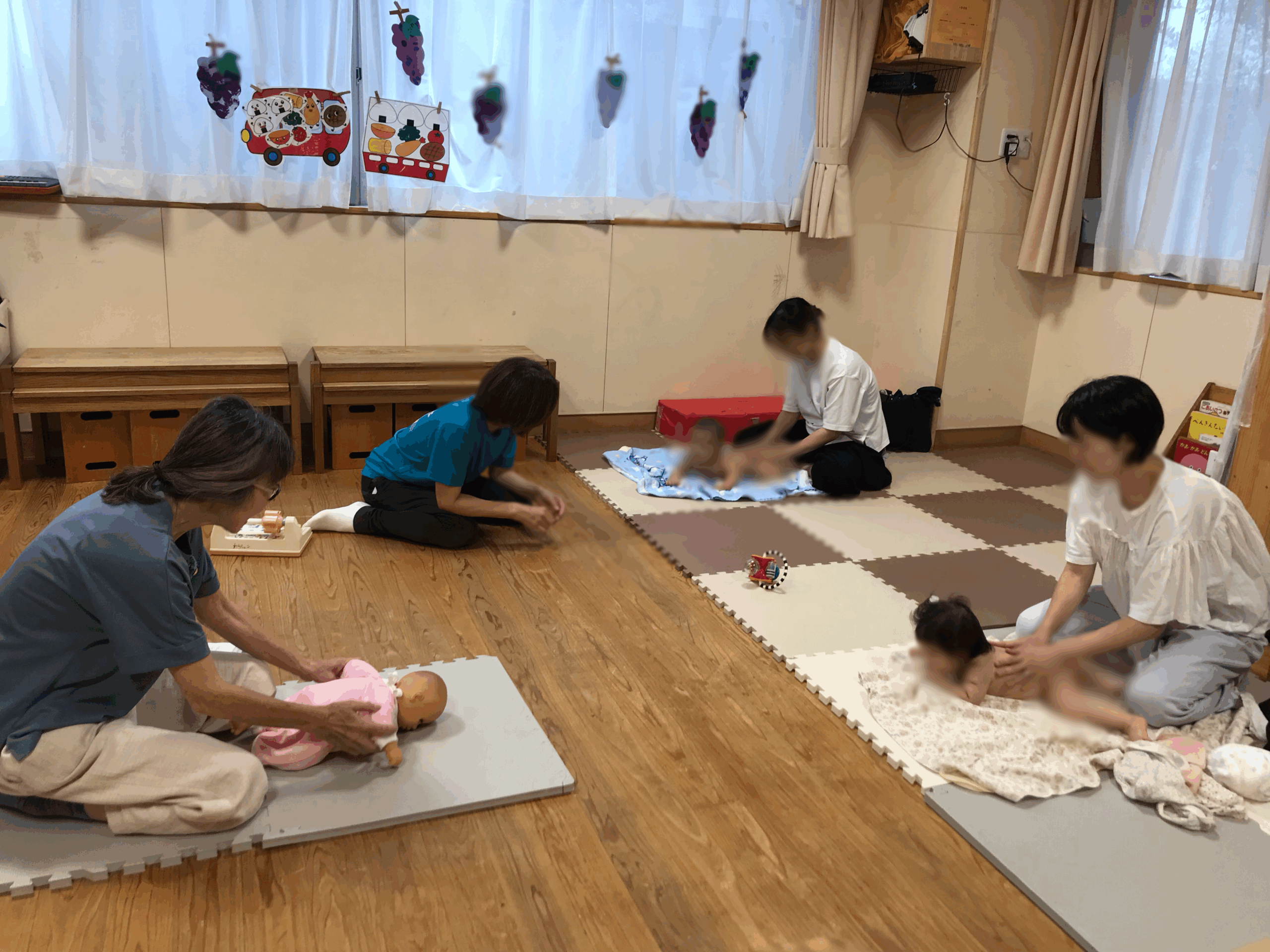 雨がぱらつく朝でしたが、涼しくなって過ごしやすくなりました。今日はベビーマッサージの講師の先生を招き、2組の親子さんの参加がありました。どちらのご家庭も